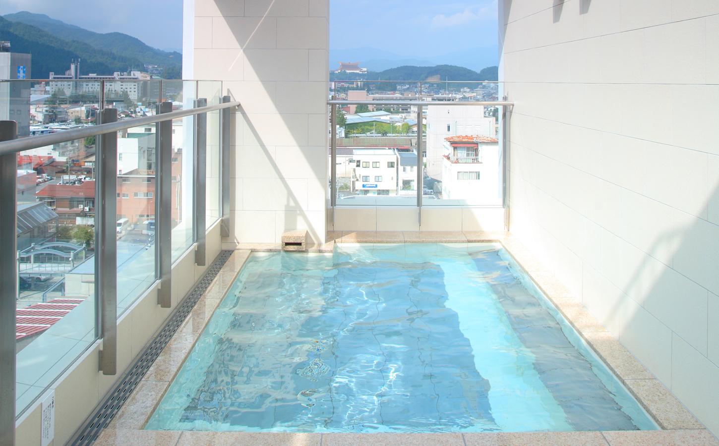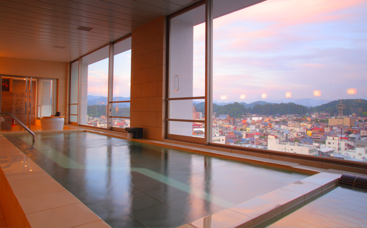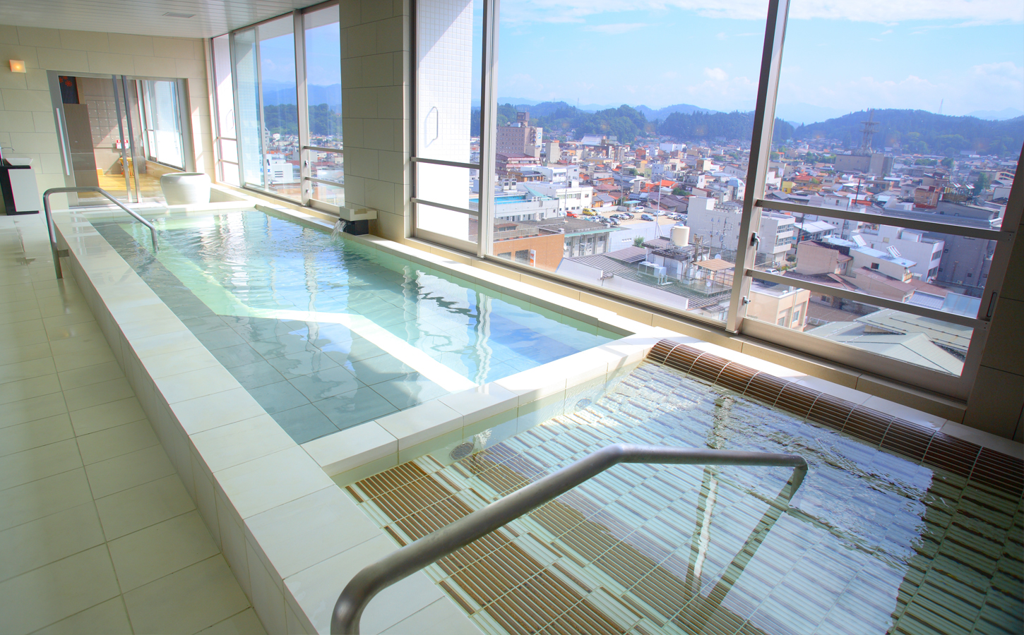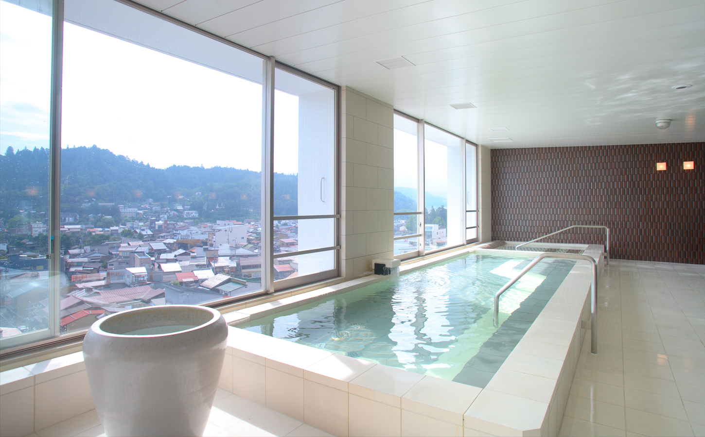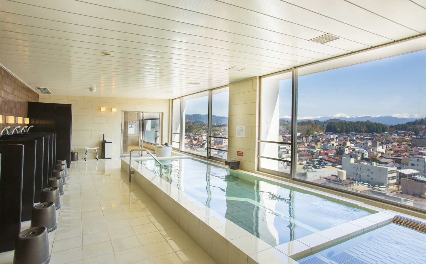 高山市内を一望できる展望露天風呂は、一番のおすすめです。 露天風呂の周囲はガラス張りになっており、温泉に浸かりながら高山市内が一望できます。天気の良い日には、くっきりと浮かび上がる北アルプスの山々が、あなたの目に飛び込んでくるに違いありません。露天風呂は、自然の中にあってこそ。 雨の日には雨の中で、雪の日には雪の中で温泉を楽しんでいただきたいから、天井は吹き抜けにしました。高山の風を、匂いを感じてください。 ※台風等の悪天候の場合、予告なく閉鎖する場合がございますので、あらかじめご了承ください。
