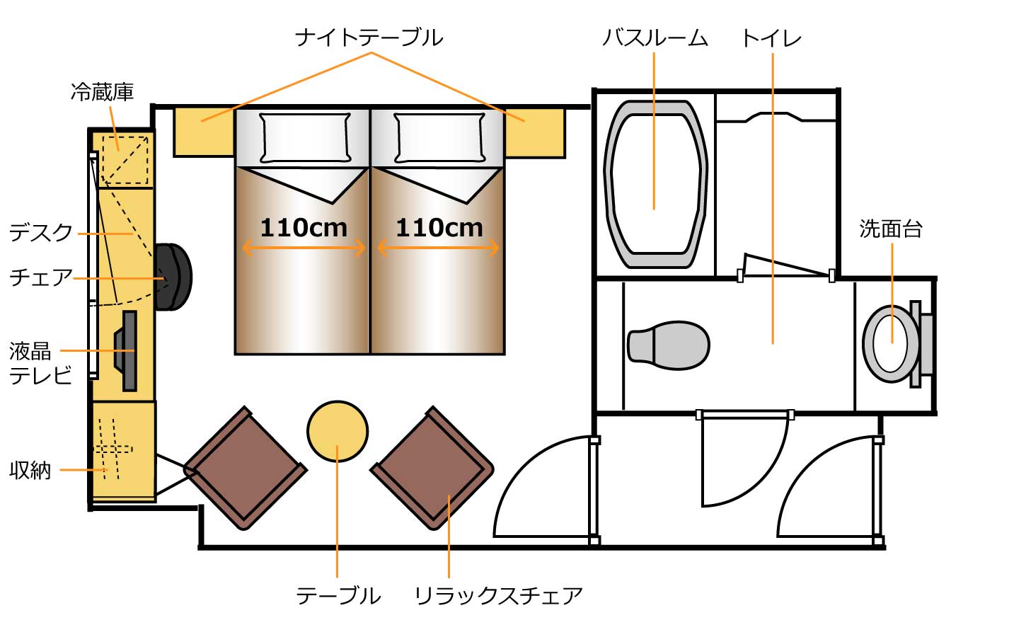 | 備考 | ※6歳未満のお子様はベッド1台につき1名様まで大人のお客様との添い寝が無料となります。(エキストラベッドは添い寝不可) ※3名様でのご宿泊について ※間取図は一例です。客室の方角、階数等により若干異なる場合がございます。 |