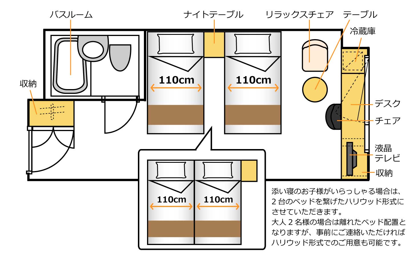 | 備考 | ※未就学のお子様はベッド1台につき1名様まで大人のお客様との添い寝が無料となります。 ※間取図は一例です。客室の方角、階数等により若干異なる場合がございます。 |